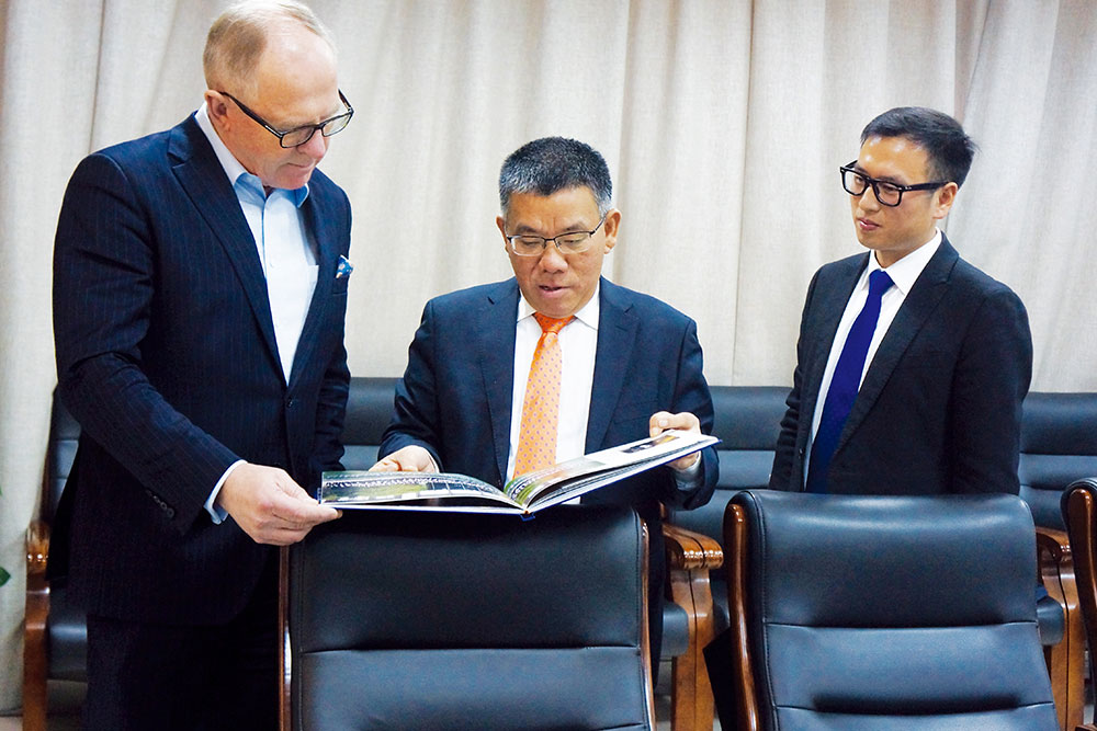 曾光安(中)向Pekka Vauramo(左)展示华体会网页版纪念画册
