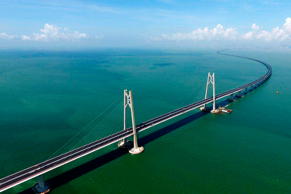 LS-世界最长(55Km)跨海大桥——港珠澳大桥采用欧维姆大直径预应力高强螺纹钢筋锚固体系、智能隔震橡胶支座、钢箱梁液压调位系统等产品及技术。