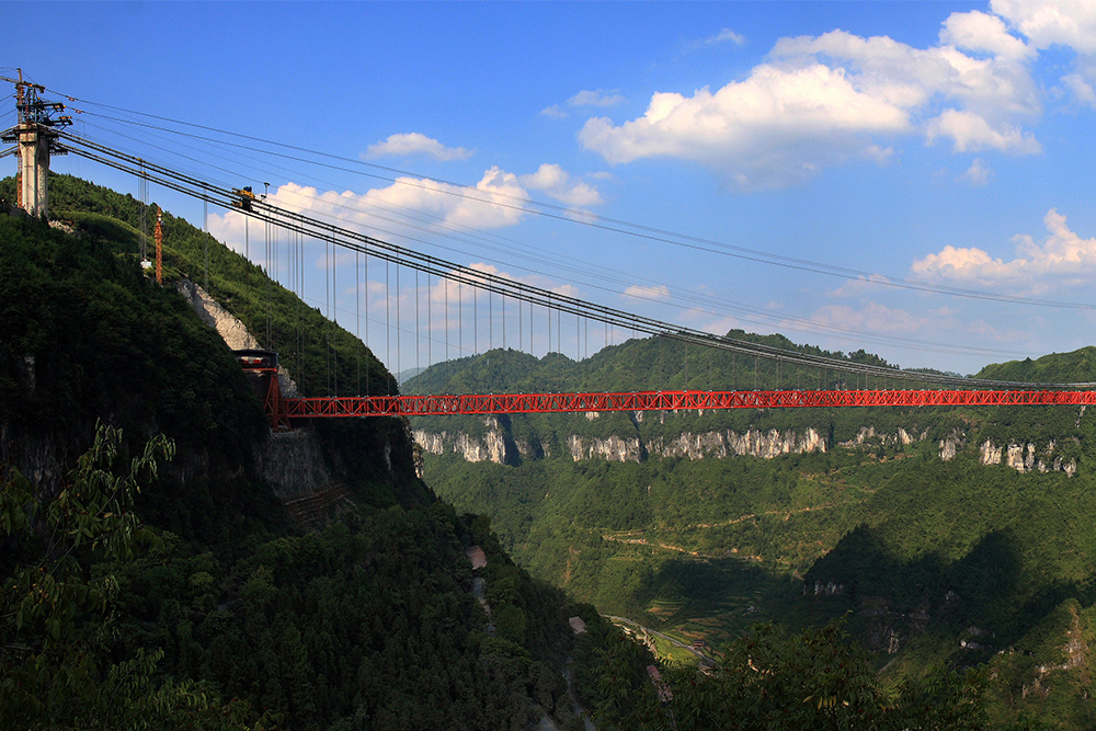 矮寨特大悬索桥为钢桁加劲梁单跨悬索桥,全长1073.65米,悬索桥的主跨为1176米,桥面设计标高与地面高差达330米左右。OVM提供了国内第一台自主研发的全液压步履式缆载吊机,配合“轨索滑移法”架设钢桁梁,成为世界首创。