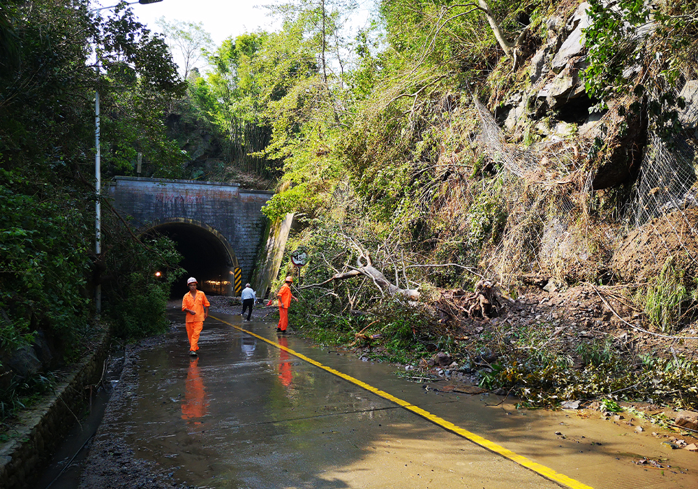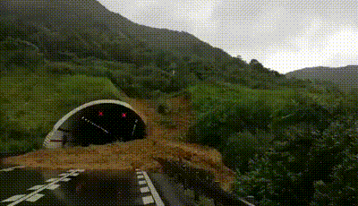 台风过后,公路隧道口被滑坡的泥土和杂树遮盖