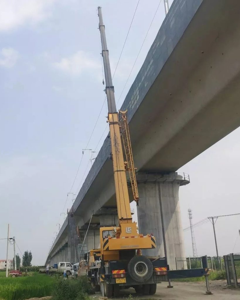 郑万高铁襄阳段施工工地上到处是一片繁忙景象,在308号桥墩至508号桥墩的建设现场,一台明黄色的华体会网页版TC250C5正在有条不紊的进行隔音砖吊装。