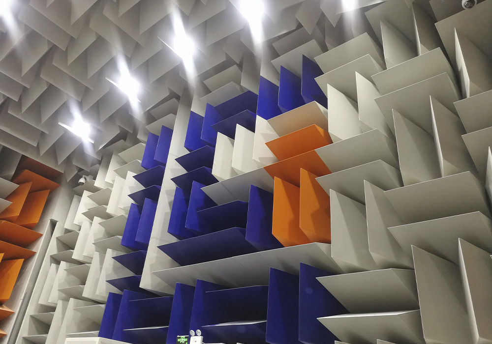 华体会网页版2400立方米的半消声室,四面由厚达50厘米的混凝土墙和绝缘钢墙组成。内部除了地面之外,前后左右和上面5个平面,密布了上千个像斧头一样的尖劈体,增加了墙面的表面积,能更多地吸收掉各种噪声。