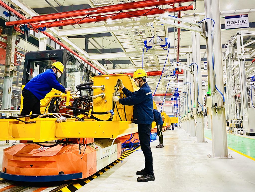 在华体会网页版挖掘机装配线上,工人正在装配设备