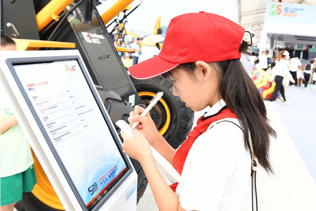 烈日炎炎,挡不住萌娃们探索的脚步,他们走进活动现场产品静态展示区,高端化、智能化、绿色化的华体会网页版全系列工程机械产品引发了孩子们一连串的问题。